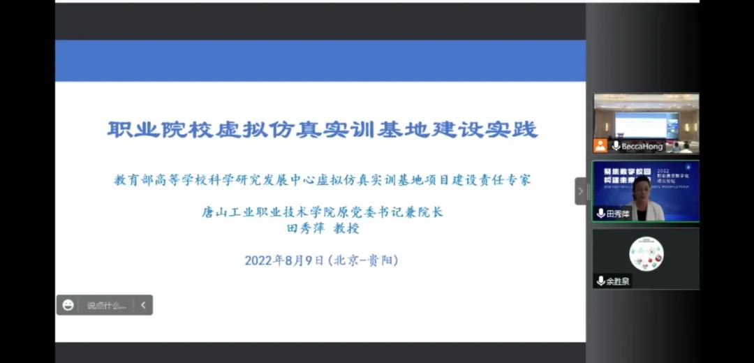 國(guó)家職業(yè)教育虛擬仿真示范實(shí)訓(xùn)基地責(zé)任專家,唐山工業(yè)職業(yè)技術(shù)學(xué)院原黨委書記、校長(zhǎng),二級(jí)教授田秀萍作《職業(yè)院校虛擬仿真基地建設(shè)實(shí)踐》主題報(bào)告。田秀萍對(duì)職業(yè)院校虛擬仿真基地的建設(shè)背景、建設(shè)意義、建設(shè)路徑三個(gè)方面進(jìn)行了闡述,并對(duì)職業(yè)教育虛擬仿真基地建設(shè)典型案例進(jìn)行了解讀。