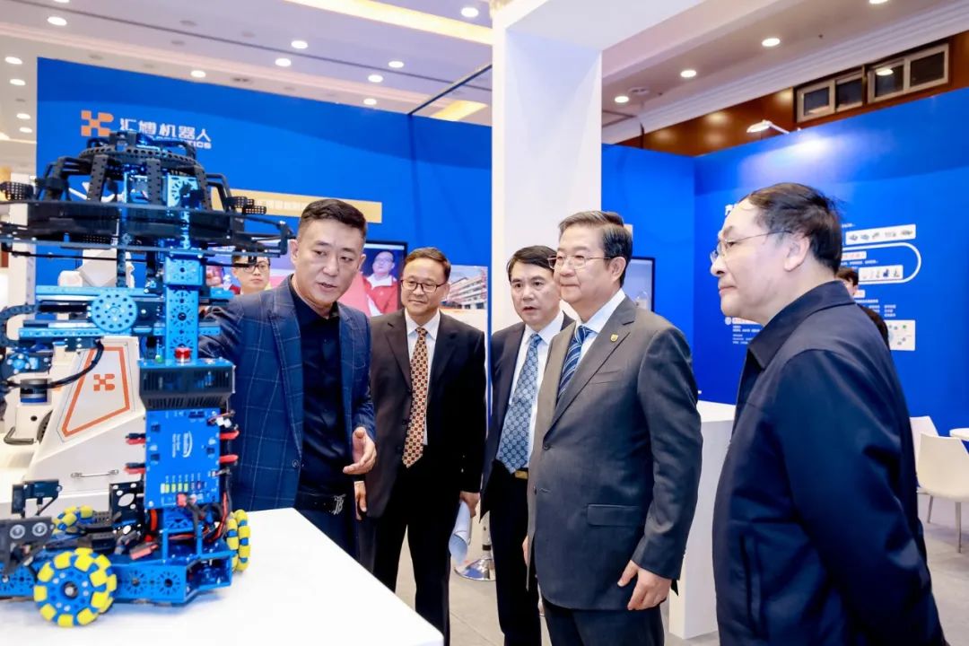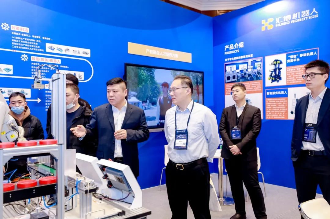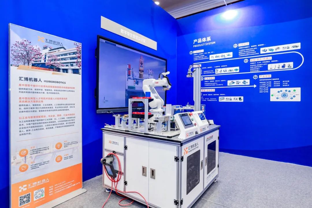 展會現場,匯博機器人圍繞“匯博智能制造教育裝備”、“產教融合人才培養方案”、“數字孿生智慧實訓室”三大模塊展示教育數字化創新探索與應用實踐。